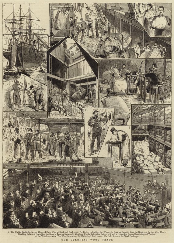 colonial · trade · wool · london · docks · blackwall docks · england · great britain · sale · rooms · interiors · dublin castle · shipping · ships · people · dock · workers · Private Collection / Bridgeman Images · / Look and Learn |
