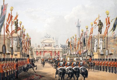 arrival · arriving · welcoming · welcome · reception · horses · horse · soldiers · soldier · london bridge · flags · procession · royal wedding · royalty · alexandra of denmark · london · rulers · royal · british · britain · great britain · england · English · Private Collection / Bridgeman Images