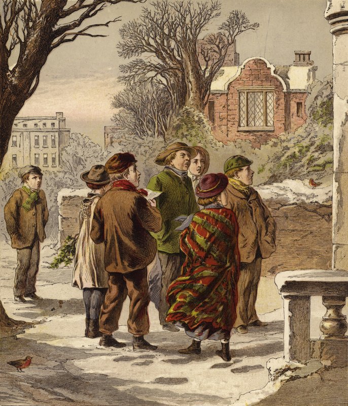 little pauls christmas · xmas · december · victorian · 19th century · festive · traditional · children · boys · girls · child · happiness · cold · snow · winter · singing · carols · music · song · robin · urban · townscape · old-fashioned · Private Collection / Bridgeman Images · / Look and Learn |