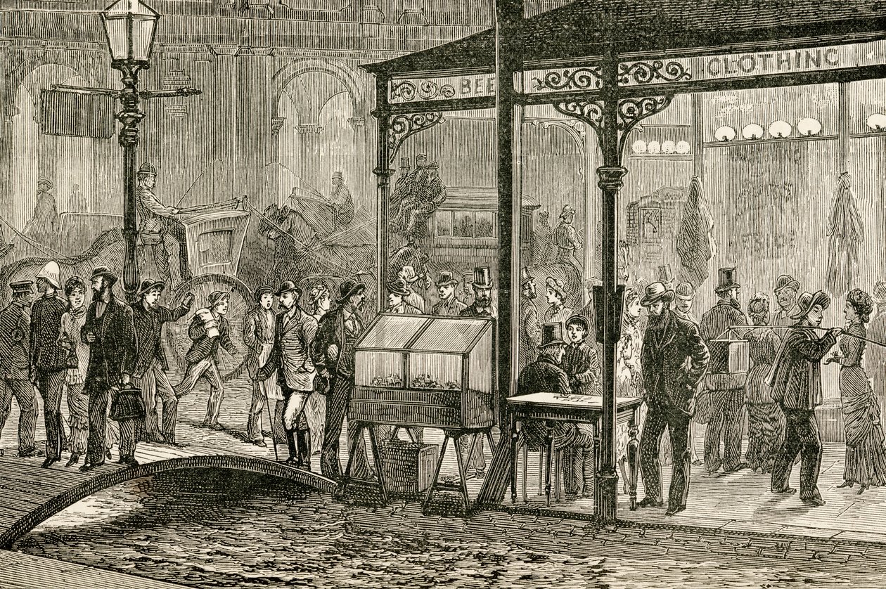 melbourne · australia · australian · street scene · c19th · male · female · pedestrians · meeting · conversing · group · groups · saturday · night · evening · illustration · bridge · stream · drain · horse · carriage · carriages · horses · Private Collection / Bridgeman Images |