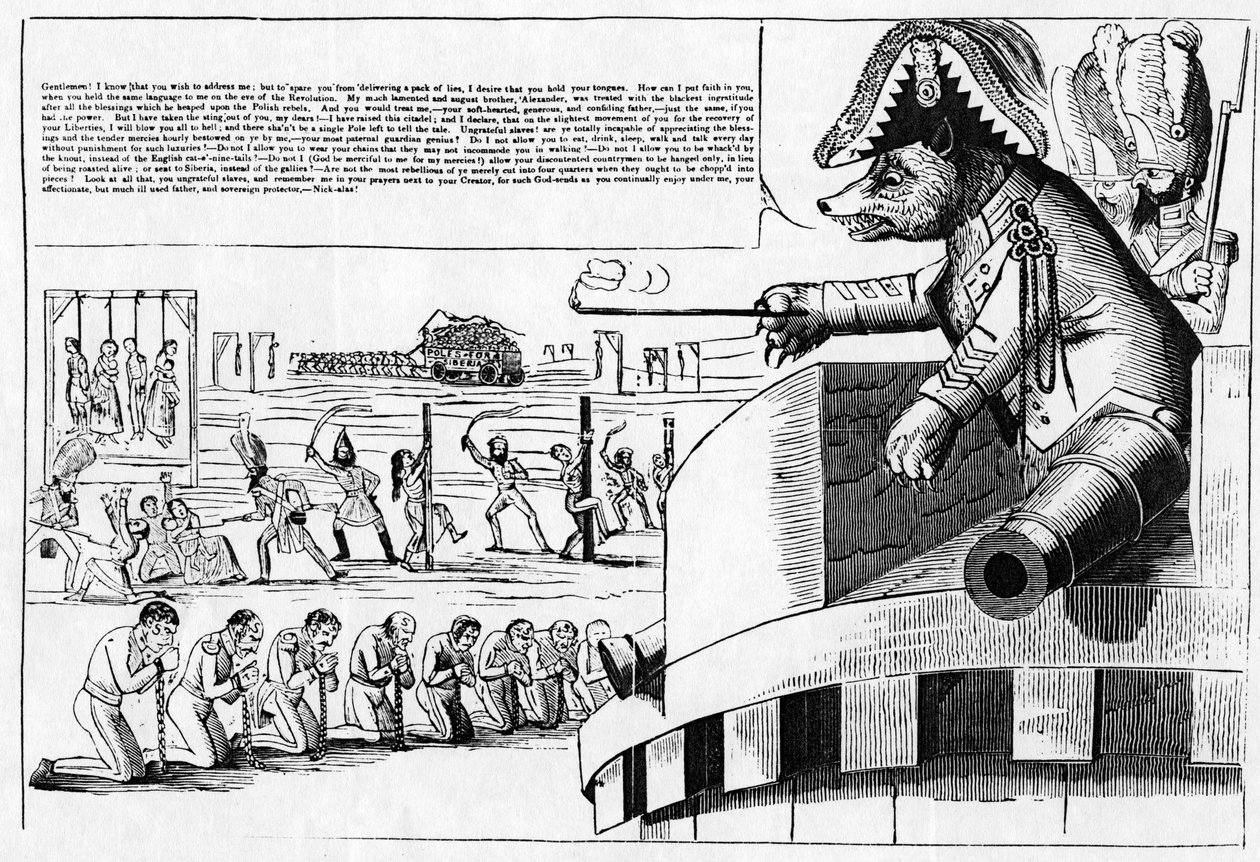 cartoon · humour · humorous · satire · satirical · bear · tsar nicholas i · poland · polish · poles · uprising · suppression · suppressing · exile · flogging · hanging · chained · shackled · bear · uniform · speech · Private Collection / Bridgeman Images |