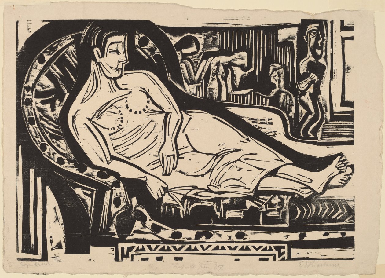 germany · female · women · woman · people · german · arts · country · seat · location · century · sofa · settee · reclining · furniture · lying down · black white · black and white · recumbent · 20th century · artistic movement · expressionism · expressionist · ernst kirchner · ernst ludwig kirchner · kirchner · ernst · heritage art · print · kirchner · ernst ludwig · die brucke · woodcut printed in black · Heritage Art/Heritage Images