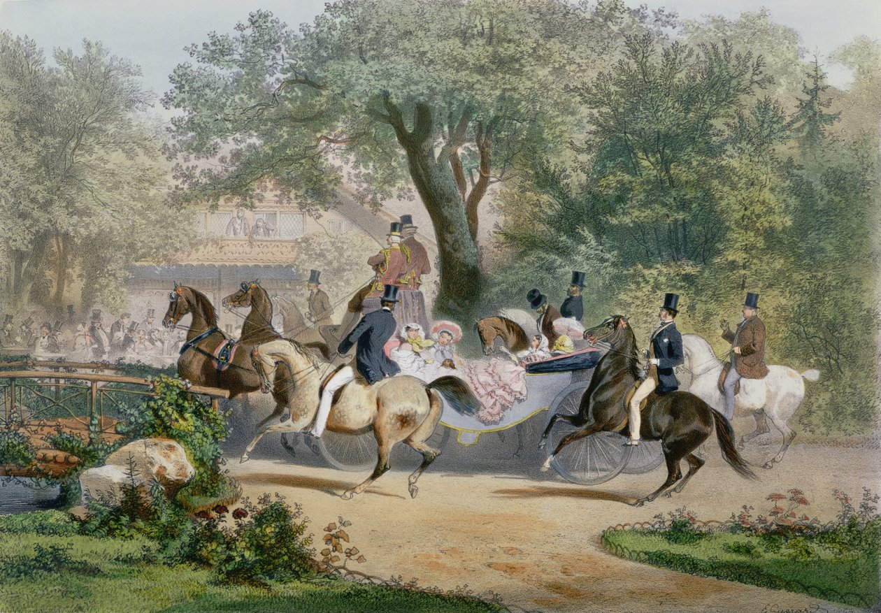 horse-drawn carriage · horse · outing · woods · forest · bois de boulogne · riding · riders · society · bourgeoisie · parisian · Musee de la Ville de Paris, Musee Carnavalet, Paris, France / Bridgeman Images