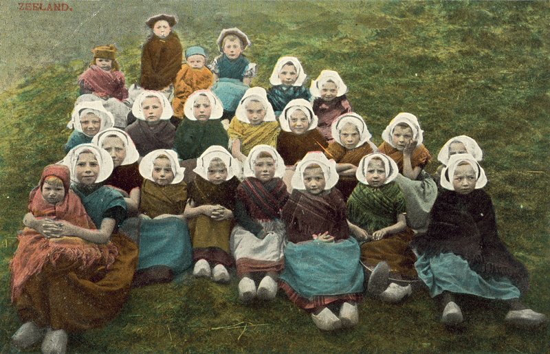 postcard · postcards · zeeland · children · netherlands · clogs · shoes · girls · national · dress · Private Collection / Bridgeman Images · / Look and Learn |