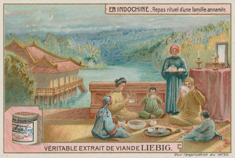 indochina · french · colonial · indonesia · asia · scenes · everyday · life · landscapes · groups · ordinary · people · traditional family meal · vietnam · eating · drinking · cross-legged · Private Collection / Bridgeman Images · / Look and Learn |