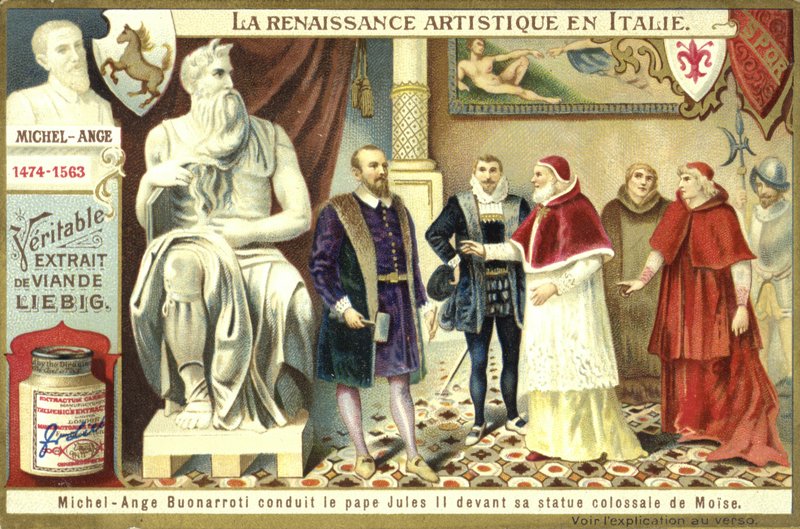 card · educational · portrait · artist · renaissance · italy · italian · history · 16th century · costume · fashion · dress · sculptor · sculpture · statue · moses · christianity · religion · michelangelo buonarotti · pope · julius ii · showing · viewing · Rome · Private Collection / Bridgeman Images · / Look and Learn