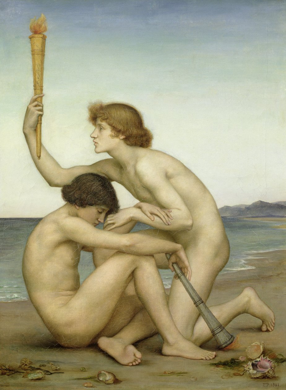 phosphorus · morning star · hesperus · evening star · dawn · light · dark · night · evening · nude · male · torch · asleep · waking · rising · seashore · beach · shells · low tide · pre-raphaelite · allegorical · homoerotic · De Morgan Collection, courtesy of the De Morgan Foundation / Bridgeman Images |