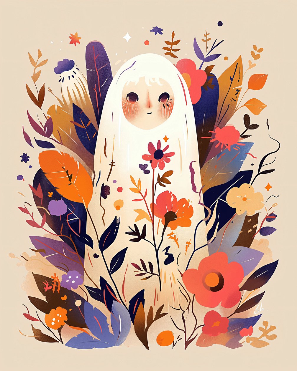 Cute Vintage Floral Ghost With Flowers(Boho wall art prints : Cute Vintage Floral Ghost With Flowers for interior decoration)F. Abderrahim |