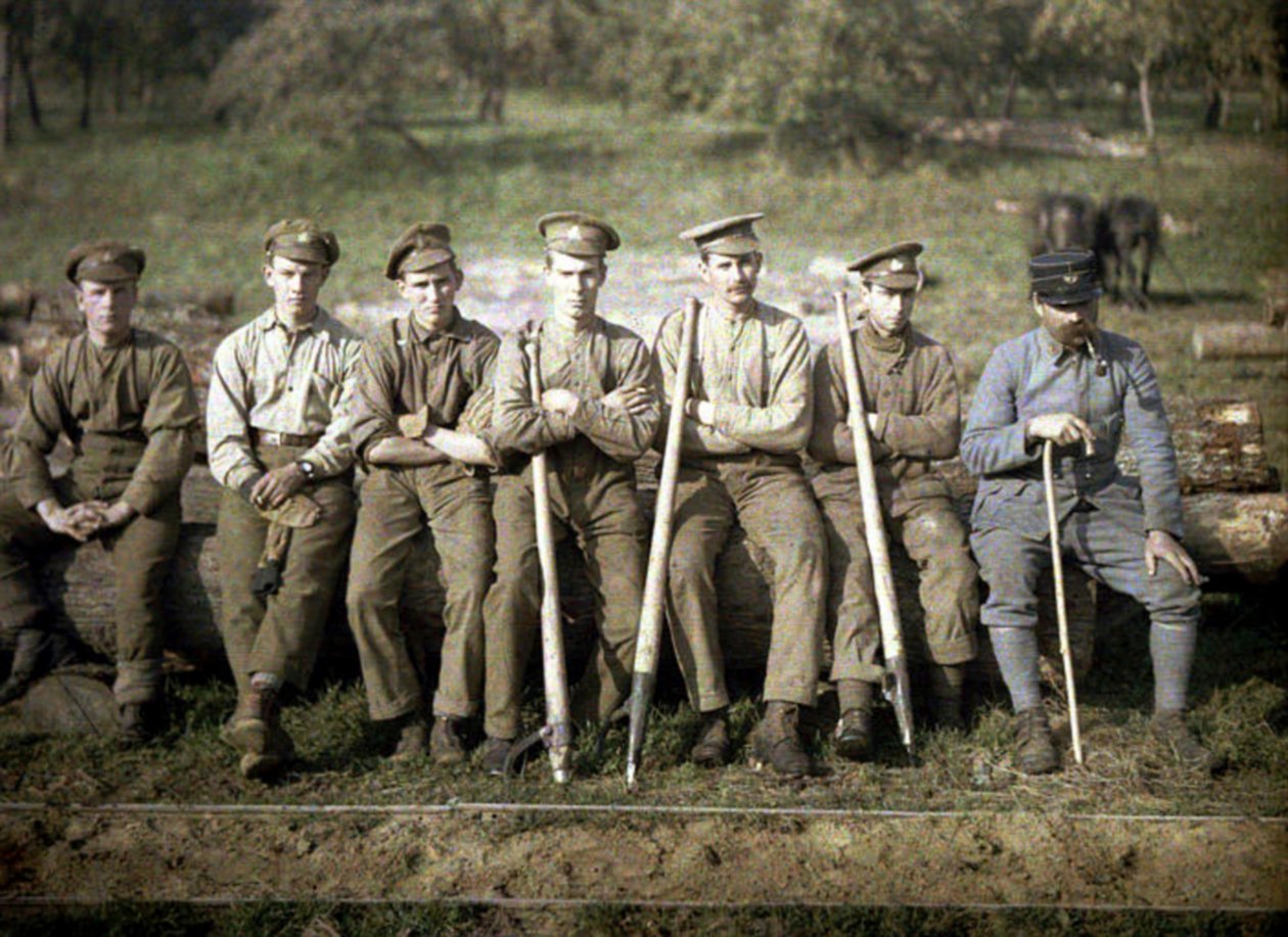 world war one · first · great war · colour photograph · colour photo · photography · military · history · historical · western front · french · male · soldiers · canadian · work · labour · sawmill · quesmy · oise · team · cant hook · tools · tree trunk · timber · outdoors · group portrait · 0 / Bridgeman Images |