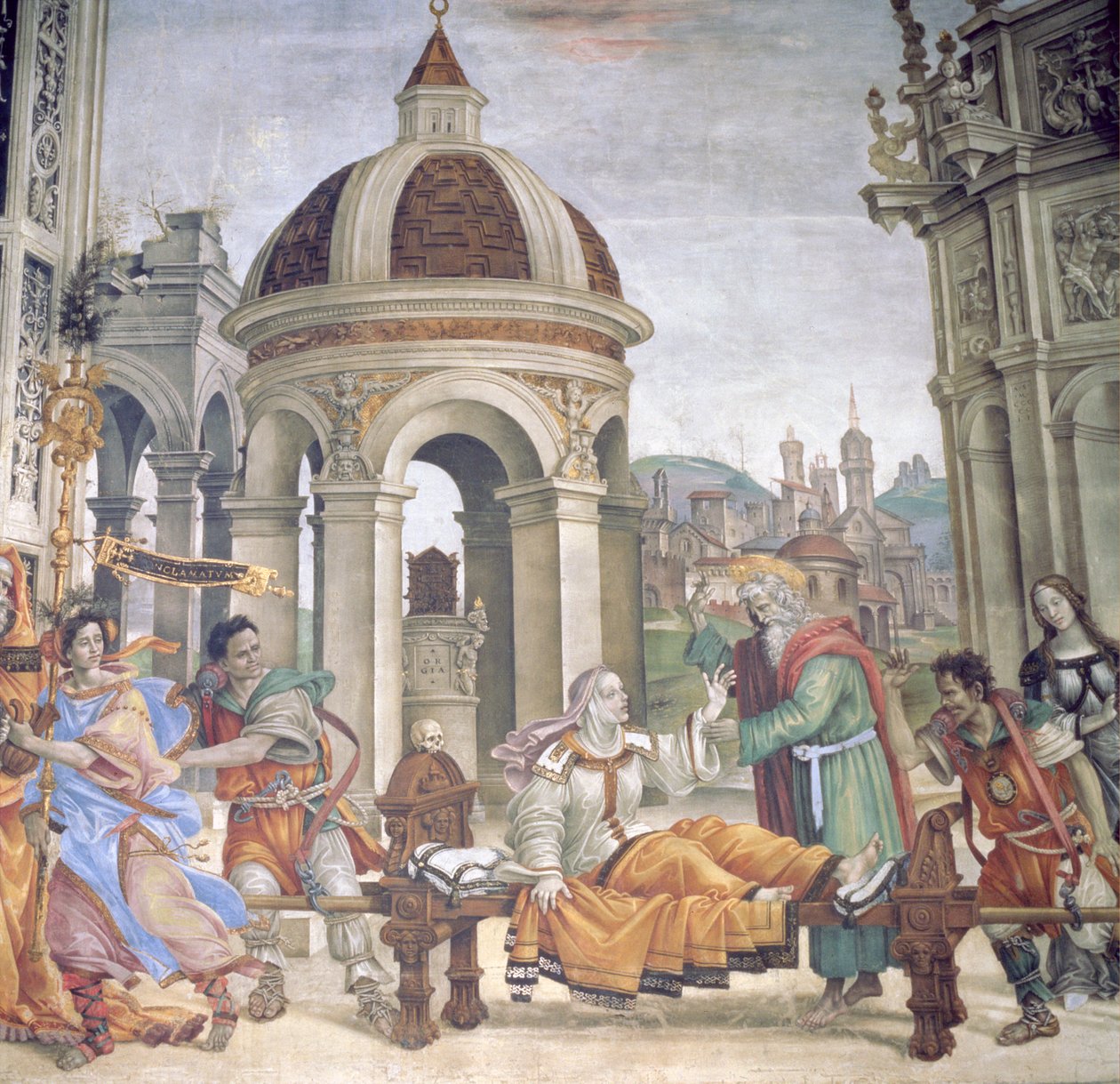 signed and dated · restored to life · miracle · saint · funeral procession · crowd · skull · temple · arch · dome · female · apostle · architecture · golden legend · renaissance · cure · healing · dome · rotunda · Santa Maria Novella, Florence, Italy / Bridgeman Images