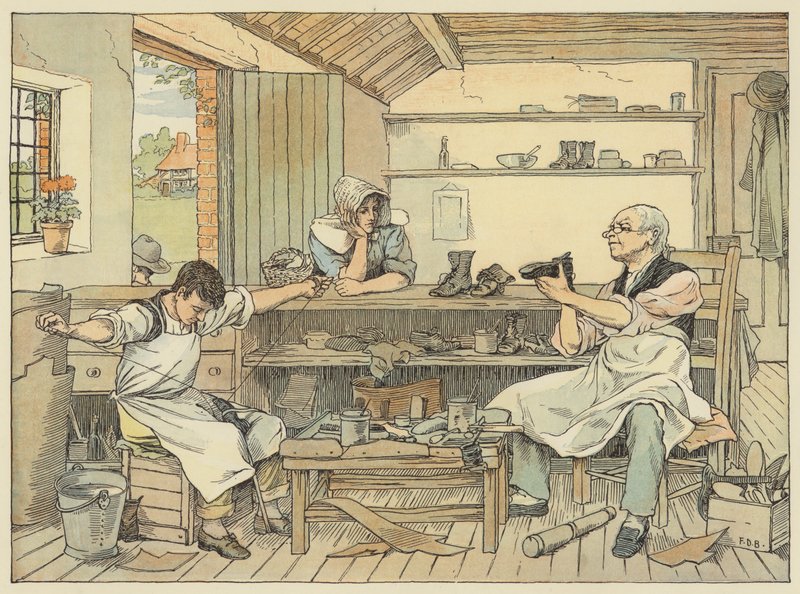 workshop · child · worker · bedford francis donkin (1864-1954) · england · united kingdom · europe · illustrator · making · profession · manual · skills · trade · type · nostalgia · nostalgic · types · shoe · work · england · cobbler · world · boots · skill · trades · occupations · shoes · professions · english · toil · / Bridgeman Images · / Look and Learn |