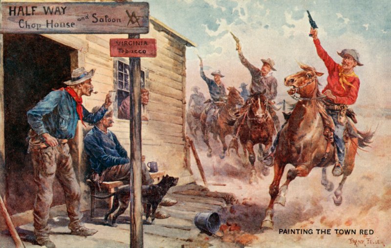 20th century · postcard · horse · animal · colour · cowboy · north america · america (continent) · saloon · print · mzprint · · Private Collection / Bridgeman Images · / Look and Learn |