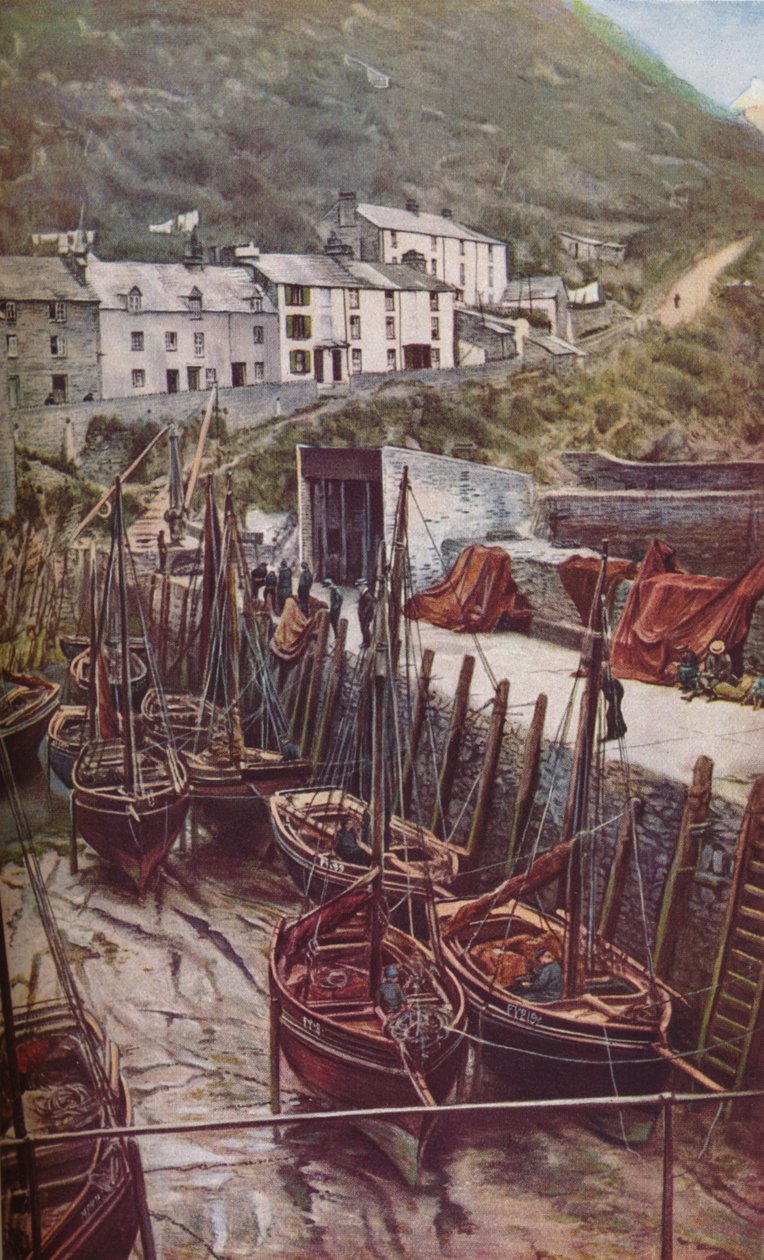 transport · transportation · exterior · outdoors · hillside · hill · building · buildings · england · people · male · boat · boats · industry · country · pier · tide · view · british · geography · english · color · colour · cottage · cornwall · village · fishing boat · location · century · vista · britain · low tide · fishing village · thirties · outside · natural phenomena · polperro · publication · fishing industry · water transport · background people · 1930s · 20th century · geographical feature · royal geographical society · landscape · view to land · local industry · geographical magazine · frank deaville walker · walker · frank deaville · The Print Collector/Heritage Images |