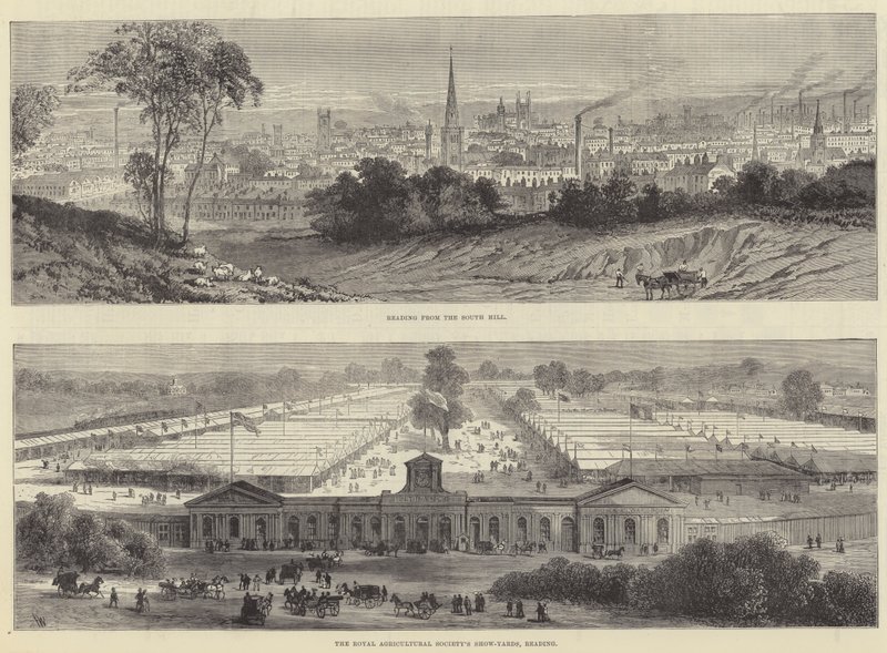 sketches · reading · south hill · royal agricultural society · show yards · agricultural shows · berkshire · townscapes · aerial views · topography · Private Collection / Bridgeman Images · / Look and Learn |