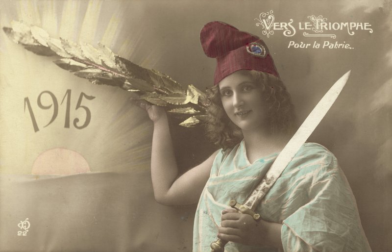 sword · home · girl · land · french · hope · symbolism · postcard · victory · glory · postcards · resilience · first world war · triumph · vers le triomphe · pour la patrie · france · Private Collection / Bridgeman Images · / Look and Learn |