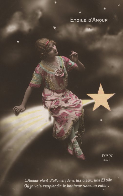 night · girl · shooting star · women · star · shooting · clouds · surrealism · cloud · pink · surrealist · surreal · postcard · woman · romantic · postcards · dress · stars · skies · girls · romance · Private Collection / Bridgeman Images · / Look and Learn |