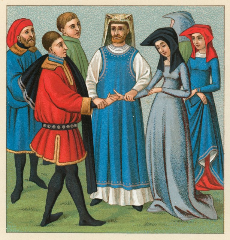 costume · dress · clothes · historical · history · national · fashion · racinet · europe middle ages costume · european · betrothal · marriage · wedding · couple · medieval · Private Collection / Bridgeman Images · / Look and Learn |