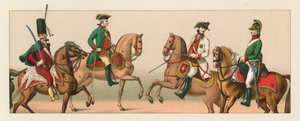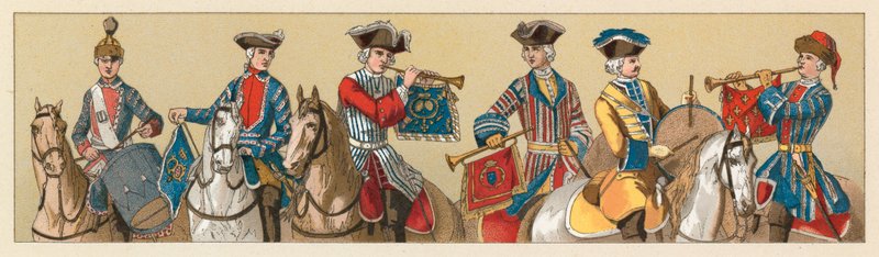 costume · dress · clothes · historical · history · national · fashion · racinet · france xviiith cent costume · french · soldiers · horses · military · Private Collection / Bridgeman Images · / Look and Learn |
