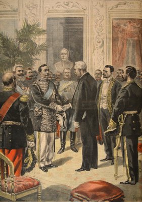 19th century · russian · russia · france · french · allies · alliance · franco-russian alliance · politician · politics · president · felix faure · receiving · reception · meeting · greeting · handshake · shaking hands · ambassador · elysee palace · welcome · welcoming · diplomat · diplomacy · foreign relations · lev vladimirovich urusov · Private Collection / Bridgeman Images · / Look and Learn