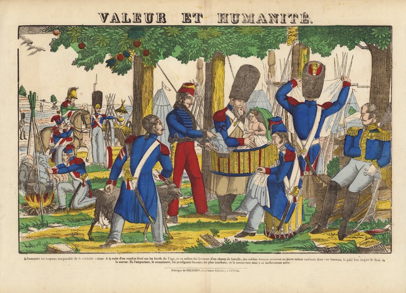 france · popular · history · historical · crude · colourful · valeur et humanite · valour · humanity · young · child · baby · soldiers · french · army · crib · save · food · Private Collection / Bridgeman Images · / Look and Learn |