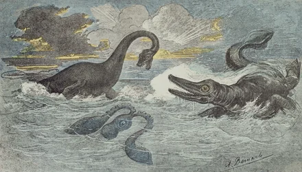 Fight between a Plesiosaurus and an Ichthiosaurus in the Liassic or Jurassic period (208 to 146 million years ago), 1880(Fight between a Plesiosaurus and an Ichthiosaurus in the Liassic or Jurassic period (208 to 146 million years ago), 1880 (colour engraving))French School |