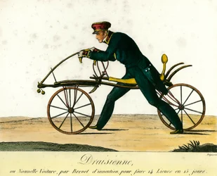Draisienne, ancestor of the bicycle, invented 1816 by Baron Karl von Drais (1785-1851), 1820(Draisienne, ancestor of the bicycle, invented 1816 by Baron Karl von Drais (1785-1851), 1820 (colour engraving))French School |