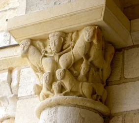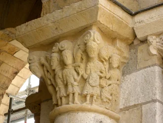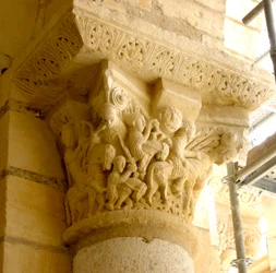 abbey · basilica · column · male · carving · carved · romanesque · medieval · knights · horses · sword · riders · church · architectural detail · Abbaye de Fleury, Saint-Benoit-sur-Loire, Loiret, France / Bridgeman Images