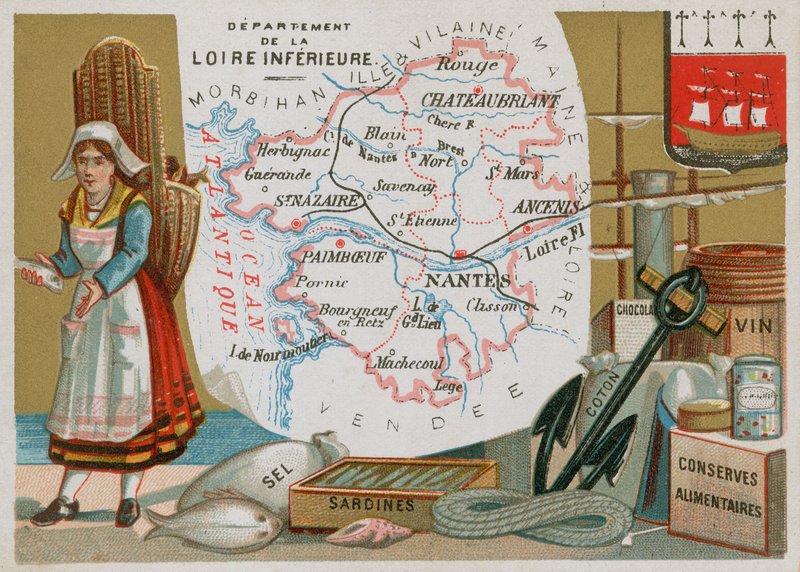 century · coat of arms · department · departments · ephemera · france · french · illustration · illustrations · local produce · maps · postcard · postcards · loire-atlantique · loire atlantique · loire inferieure · loire-inferieure · fish · traditional dress · sardines · salt · brittany · anchor · rope · wine · chocolate · cotton · breton · Canned Food · Private Collection / Bridgeman Images · / Look and Learn |
