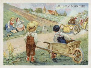 advertising · ephemera · children · girls · boys · dutch · holland · playing · looking · watching · clogs · traditional dress · windmill · river · dyke · apprentis marins hollondais · au bon marche · department store · shop · store · france · french · Private Collection / Bridgeman Images · / Look and Learn |
