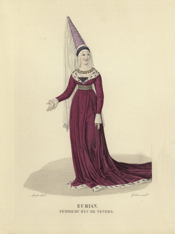 france · french · costume · women · female · woman · dress · clothes · historical · fashion · headdress · eurian · duchess of nevers · medieval · middle ages · nobility · Private Collection / Bridgeman Images · / Look and Learn |