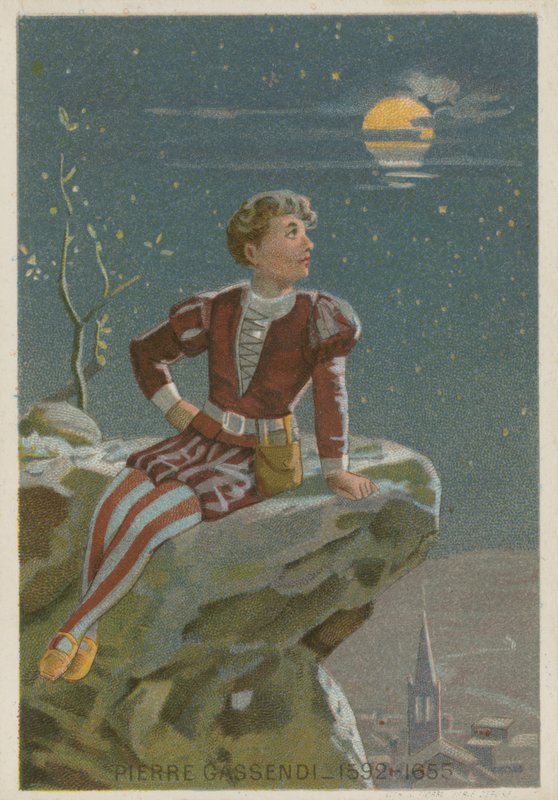 educational · card · pierre gassendi · french · 17th century · philosophy · philosopher · science · scientist · mathematics · mathematician · costume · child · childhood · youth · young · thinking · dreaming · contemplation · contemplating · moon · night sky · astronomy · astronomer · Private Collection / Bridgeman Images · / Look and Learn |