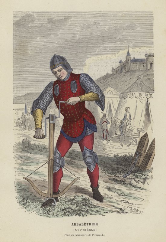 paris · parisian · france · french · costume · dress · clothes · historical · armour · soldier · weapon · warfare · military · crossbow · crossbowman · 15th century · medieval · middle ages · Private Collection / Bridgeman Images · / Look and Learn