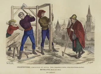 paris · parisian · france · french · costume · dress · clothes · historical · fashion · fashions · carpenters · working · workers · working class · beggar · poor · poverty · begging · building · construction · tools · wood · timber · 15th century · medieval · Middle Ages · Private Collection / Bridgeman Images · / Look and Learn