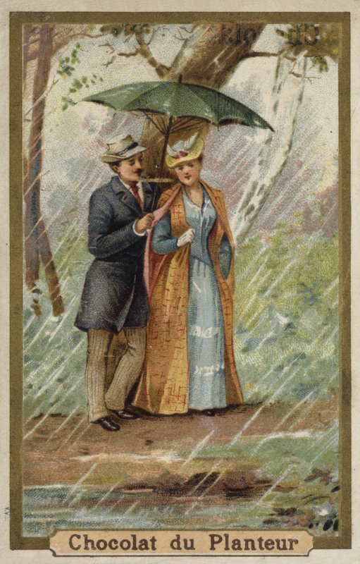 card · walking · leisure · couple · woman · fashion · costume · dress · umbrella · sheltering · rain · raining · weather · Chocolat Du Planteur · Private Collection / Bridgeman Images · / Look and Learn |