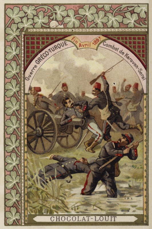 card · history · chocolat-louit · greco-turkish war · 19th century · warfare · greek · turkish · soldiers · battlefield · army · fighting · greece · balkans · battle of karavan-serai · Private Collection / Bridgeman Images · / Look and Learn