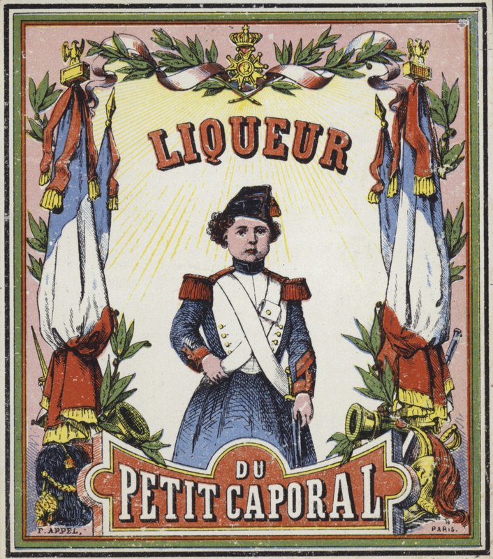 product · label · labels · liqueurs · uniforms · people · children · hats · headgear · flags · century · liqueur du petit caporal · Private Collection / Bridgeman Images · / Look and Learn |