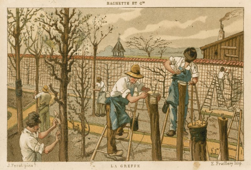 french · france · agriculture · rural life · countryside · workers · working · trees · grafting · horticulture · stepladders · Private Collection / Bridgeman Images · / Look and Learn |
