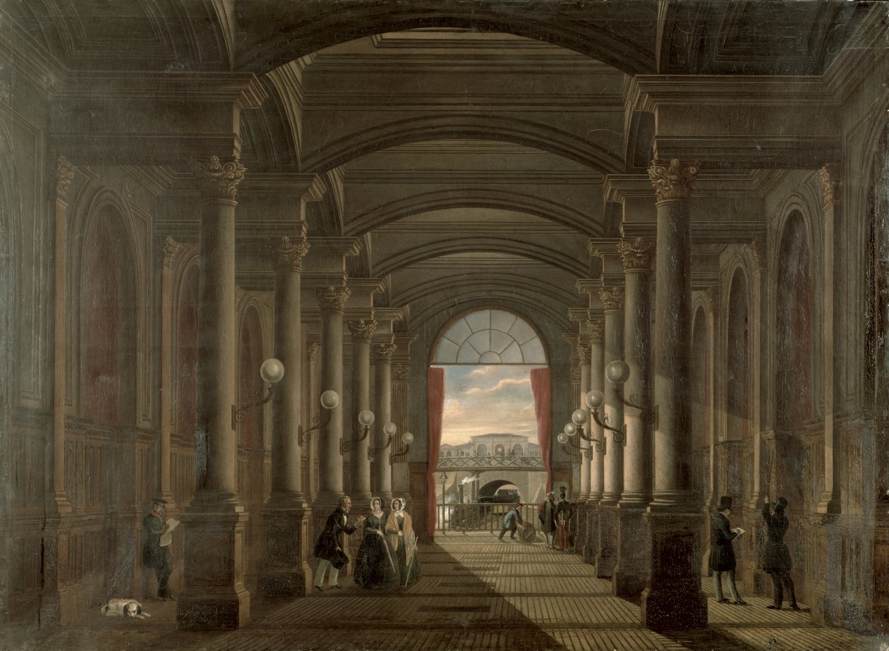 interieur de la · lazare · station · railway · rail · train · passengers · travellers · waiting · columns · colonnade · architecture · saint · Musee de la Ville de Paris, Musee Carnavalet, Paris, France / Bridgeman Images