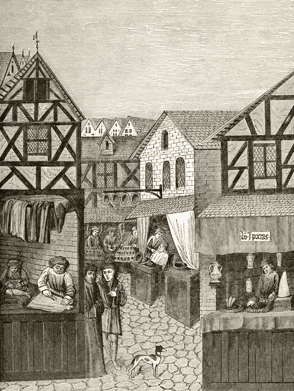 street scene · apothecary · barber · tailor · furrier · shop · trade · tradesmen · shop fronts · awning · c15th · medieval · Private Collection / Bridgeman Images