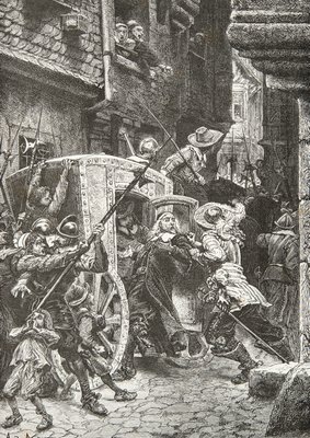 engraving · black and white · military · political · paris · engraving · transport vehicle · french · street scene · arrest · history · fiacre · made various · armee · coupling · parliament · french · france · sling (1648-1652) · bianchetticor · 19 · Private Collection / Bridgeman Images