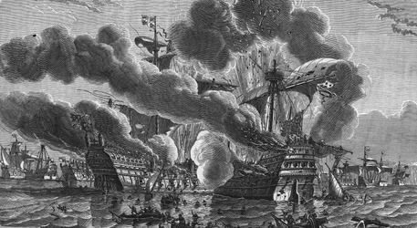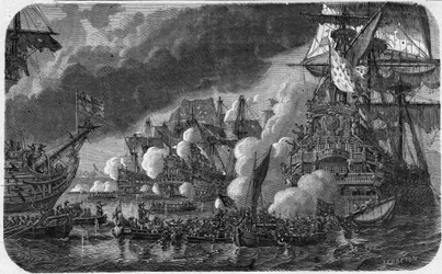 colour · colours · color · engraving · black and white · england · naval battle · engraving · english · transport vehicle · french · navy · military navy · history · battle · british · combat · brittany · dutch · defeat · armee · french · france · great · british · bianchetticor · english · dutch · Neerlanders · Private Collection / Bridgeman Images