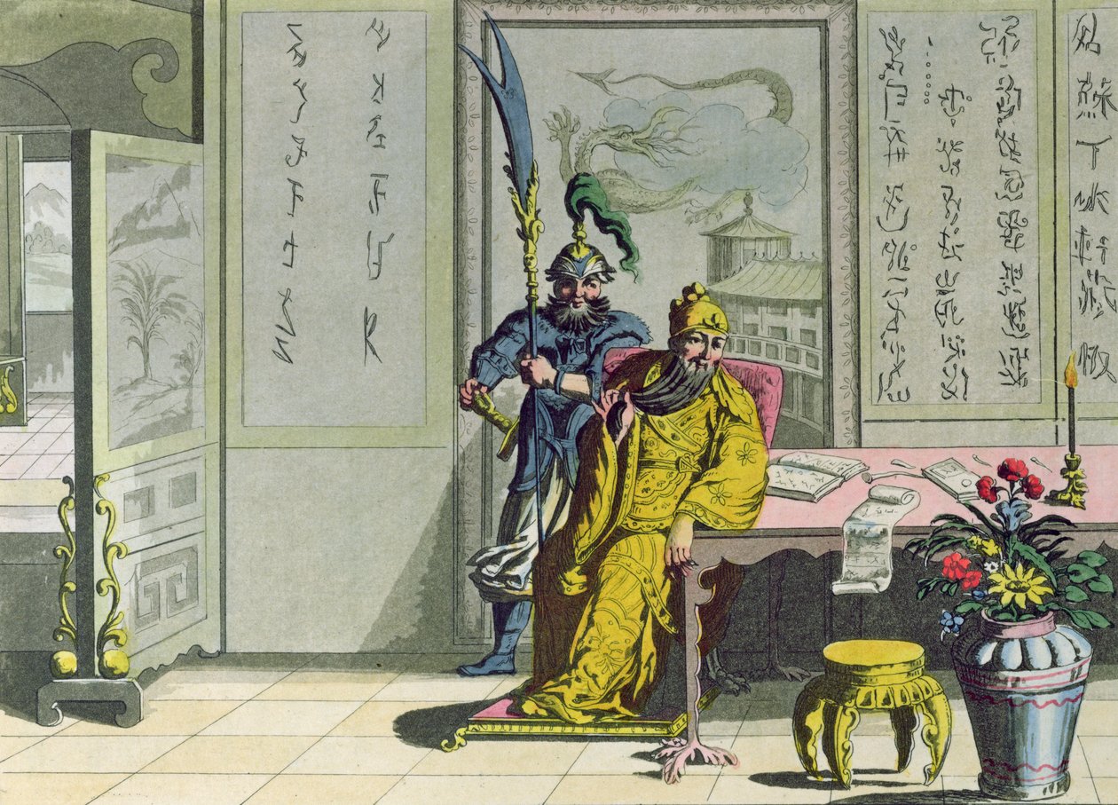 china · ruler · emperor · seated · leader · portrait · interior · quantecong · attendant · guard · servant · yellow dress · male · hoangti · chin shih-huang ti · c03rd- · shi huang-ti · 256-206 bc · qin dynasty · chin · asian · chinese · asia · Private Collection / Bridgeman Images