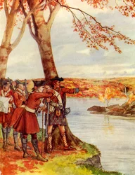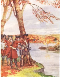 soldier · soldiers · pointing · gesturing · scottish landscape · river · riverbank · traditional dress · traditional costume · military uniform · tricorn · tricorns · rifle · rifles · autumn · fall · autumnal · Private Collection / Bridgeman Images