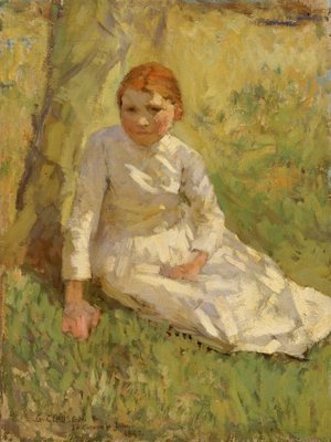 nature · exterior · outdoors · tree · field · fields · female · people · girl · girls · sitting · plant · plants · white · grass · green · color · dress · farmland · victorian · century · concept · seated · one person · pastel · redhead · underneath · under · looking away · below · oil painting · colour · realism · 19th century · nineteenth century · trees · oil on canvas · outside · portrait · white colour · green colour · george clausen · clausen · george · sir george clausen · national museum of wales · ©National Museum of Wales/Heritage Images
