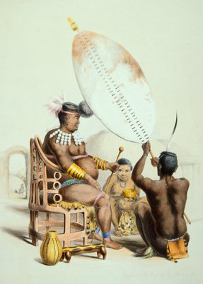 19th century · africa · south africa · jewel · colonialism · colony · colour · custom (habit) · servant · ethnography · anthropology · fan (object) · woman · united kingdom · europe · warrior · native · population · portrait · king · royalty · tradition · culture · seated · lithograph · print · traditional costume · clothes · headdress · · / Bridgeman Images