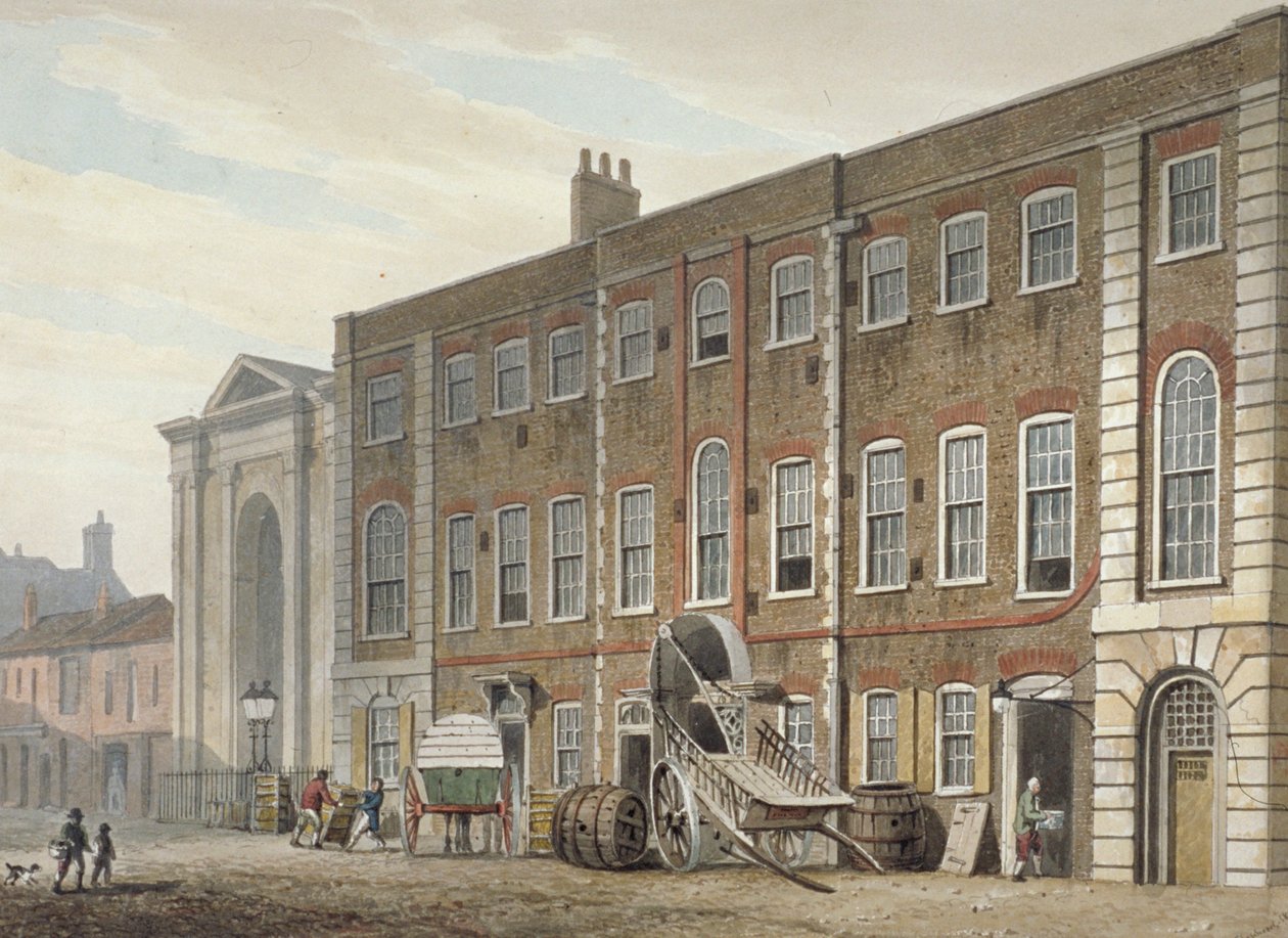 transport · transportation · exterior · road · building · buildings · london · england · people · architecture · street · country · warehouse · theatre · british · english · color · colour · lane · industrial · avenue · cart · westminster · location · century · britain · outside · barrel · barrels · road transport · 19th century · nineteenth century · city of westminster · guildhall library art gallery · portugal street · watercolour · george shepherd · salopian china warehouse · lincoln's inn fields theatre · shepherd · george · London Metropolitan Archives (City of London)/Heritage Images