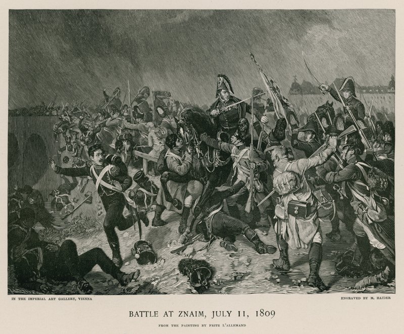 napoleon bonaparte · emperor · french · military · political · leaders · horses · soldiers · battle of znaim · znaim · czech republic · south moravia · century · battles · battlefields · dramatic · Private Collection / Bridgeman Images · / Look and Learn |