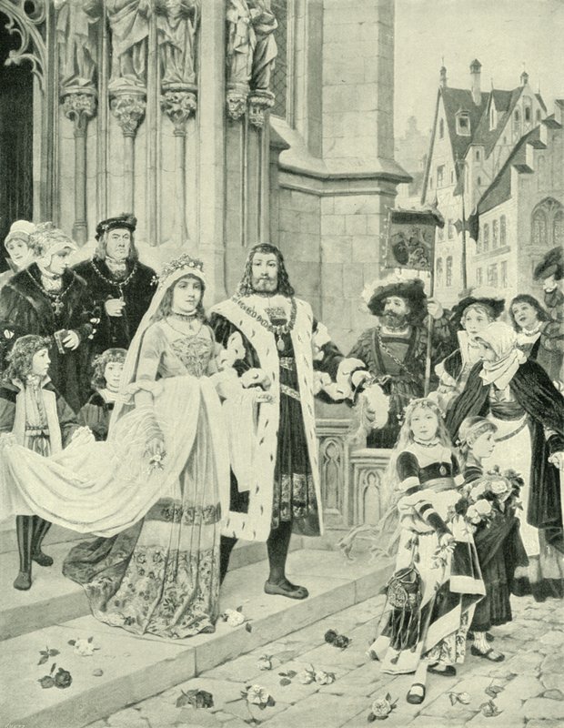 german · germany · nuremberg · 15th century · renaissance · church · fashion · costume · dress · marriage · wedding · wedding day · artist · painter · bride · bridesmaids · bridegroom · albrecht durer · agnes frey · printmaker · Private Collection / Bridgeman Images · / Look and Learn |