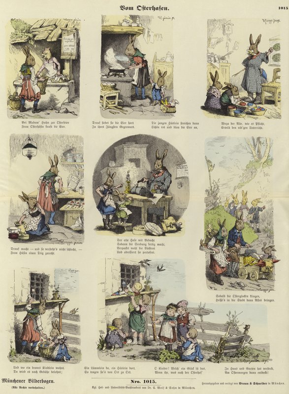 german · easter bunny · easter · rabbits · anthopomorphic · anthropomorphism · family · home · animals · children · Private Collection / Bridgeman Images · / Look and Learn |