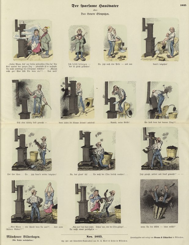 german · humour · thrift · thrifty · househusband · cutting corners · saving · cleaning · stove · chimney · dirty · soot · chores · domestic · home · kitchen · housewife · Private Collection / Bridgeman Images · / Look and Learn |
